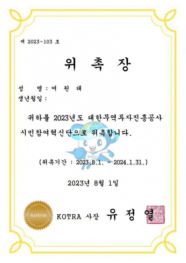 Letter of Appointment of KOTRA Citizen Participation Innovation Group 관련링크 mondereve 828 0 본문 Letter of Appointment of KOTRA Citizen Participation Innovation Group SHARE THIS PAGE 목록